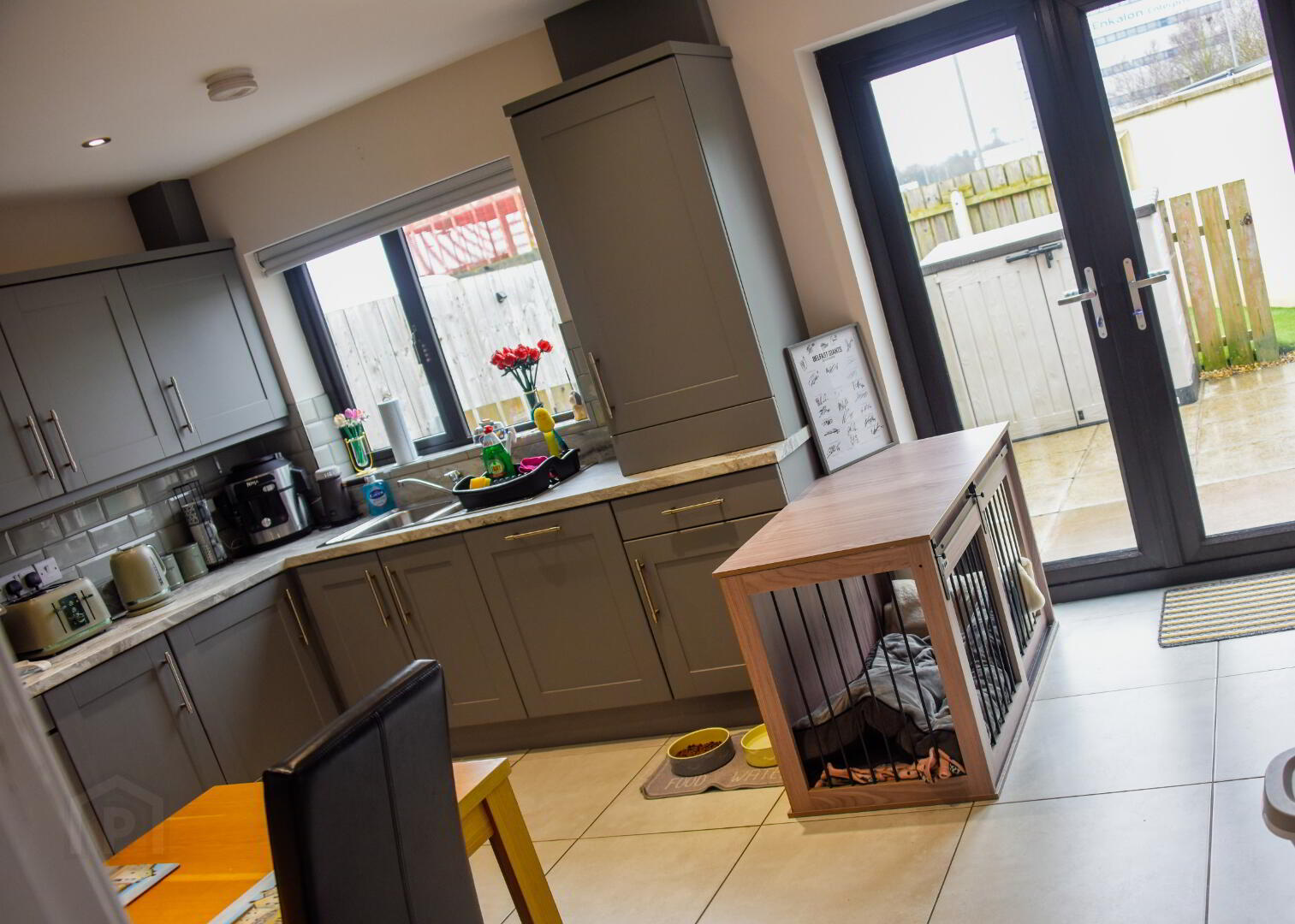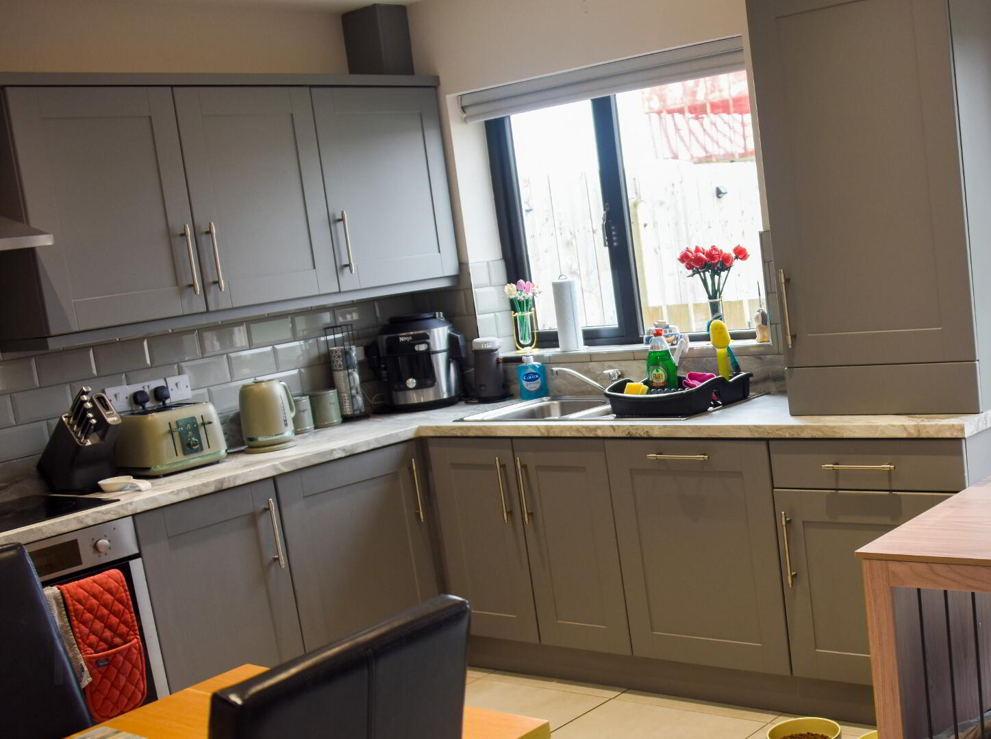 Kitchen -5.4m x 3.8m Tiled flooring, modern shaker style kitchen with all built in appliances to include fridge/freezer, washing machine and dishwasher,
