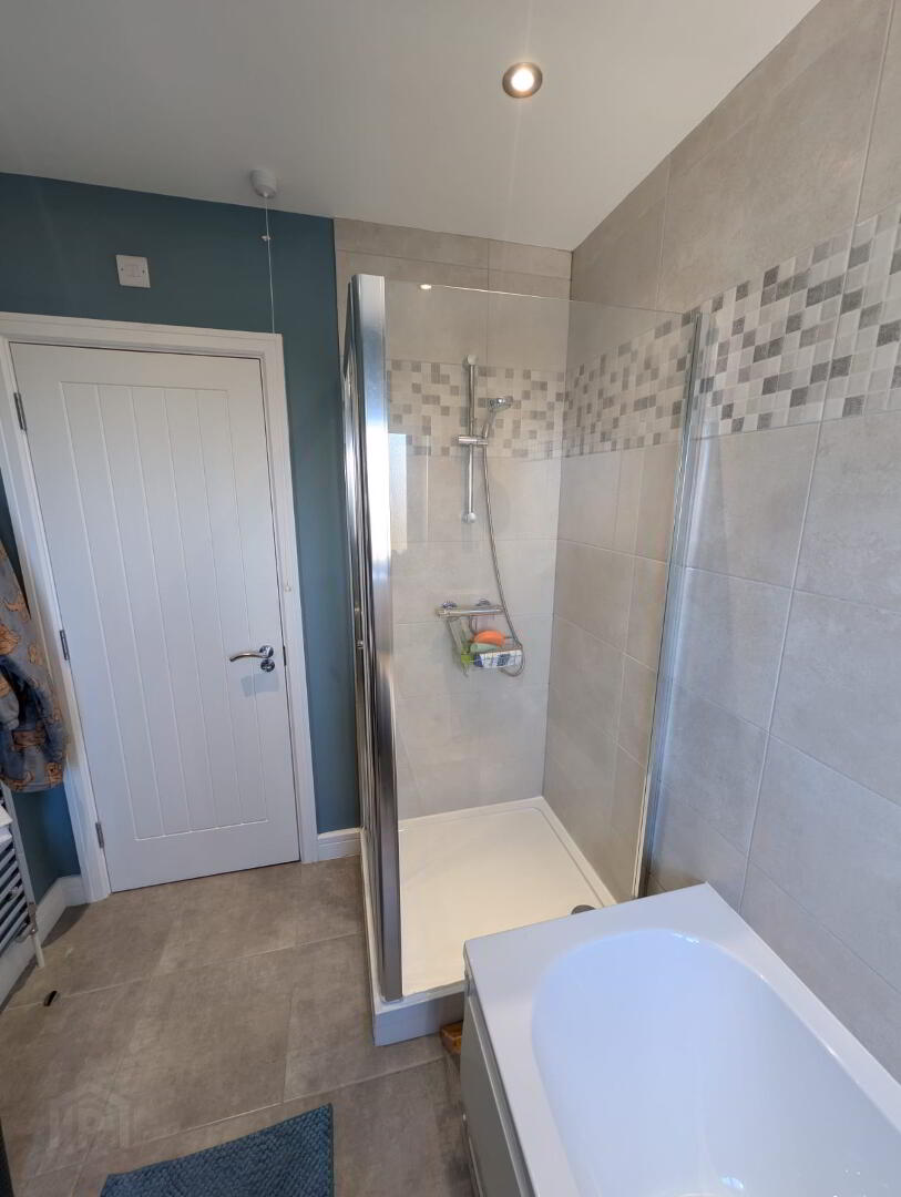 Bathroom - Tiled flooring with white 4 piece suite including walk in thermostatic shower and bath.